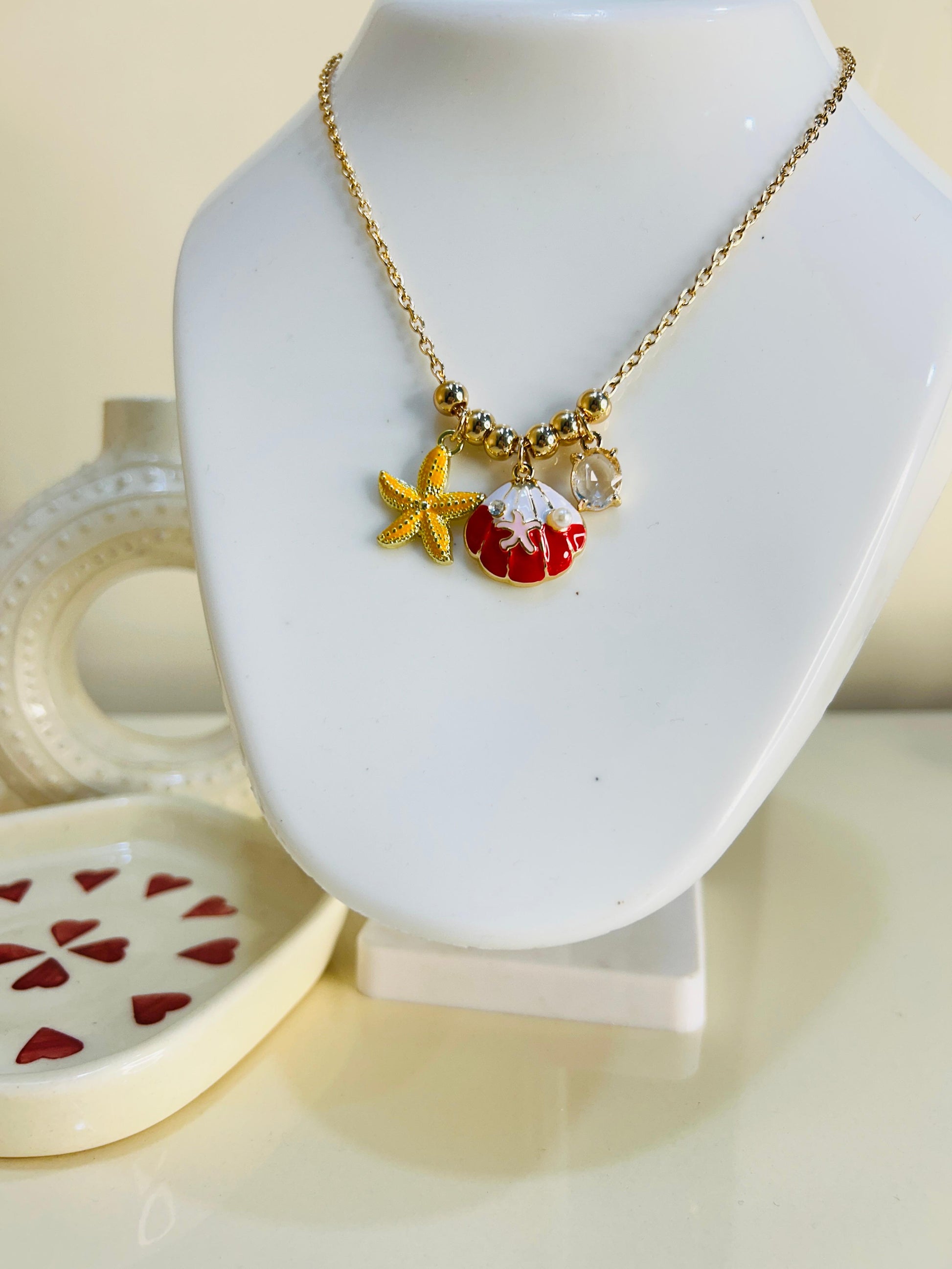 Enhance your beach look with our Beachy necklace. Featuring a starfish, shell, and stud multi charm necklace, this piece is perfect for adding a touch of coastal charm to any outfit. With its intricate design and high-quality materials, this necklace is sure to be a staple in your jewelry collection.