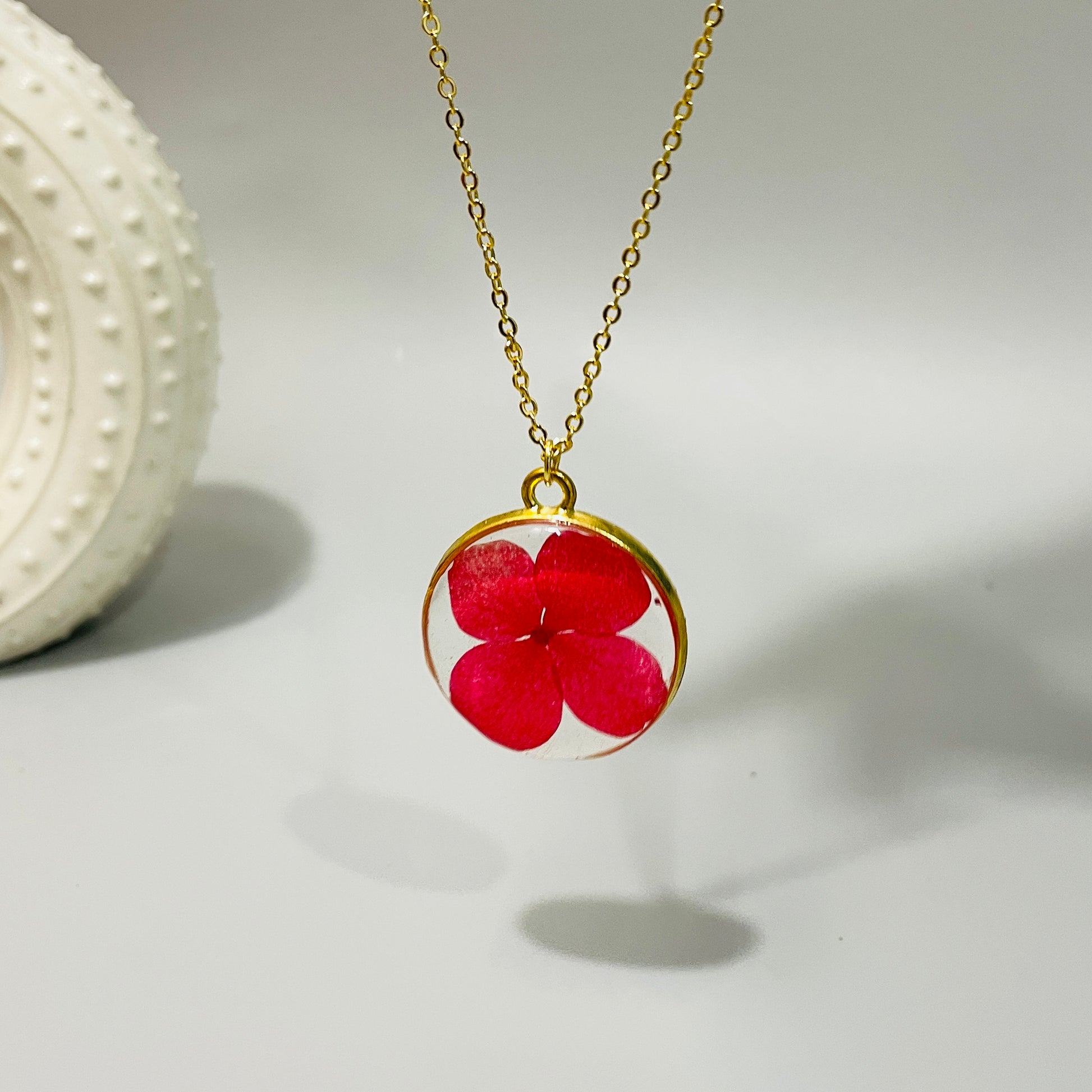 Materials- Gold rim, pressed flower, resin, brass chain