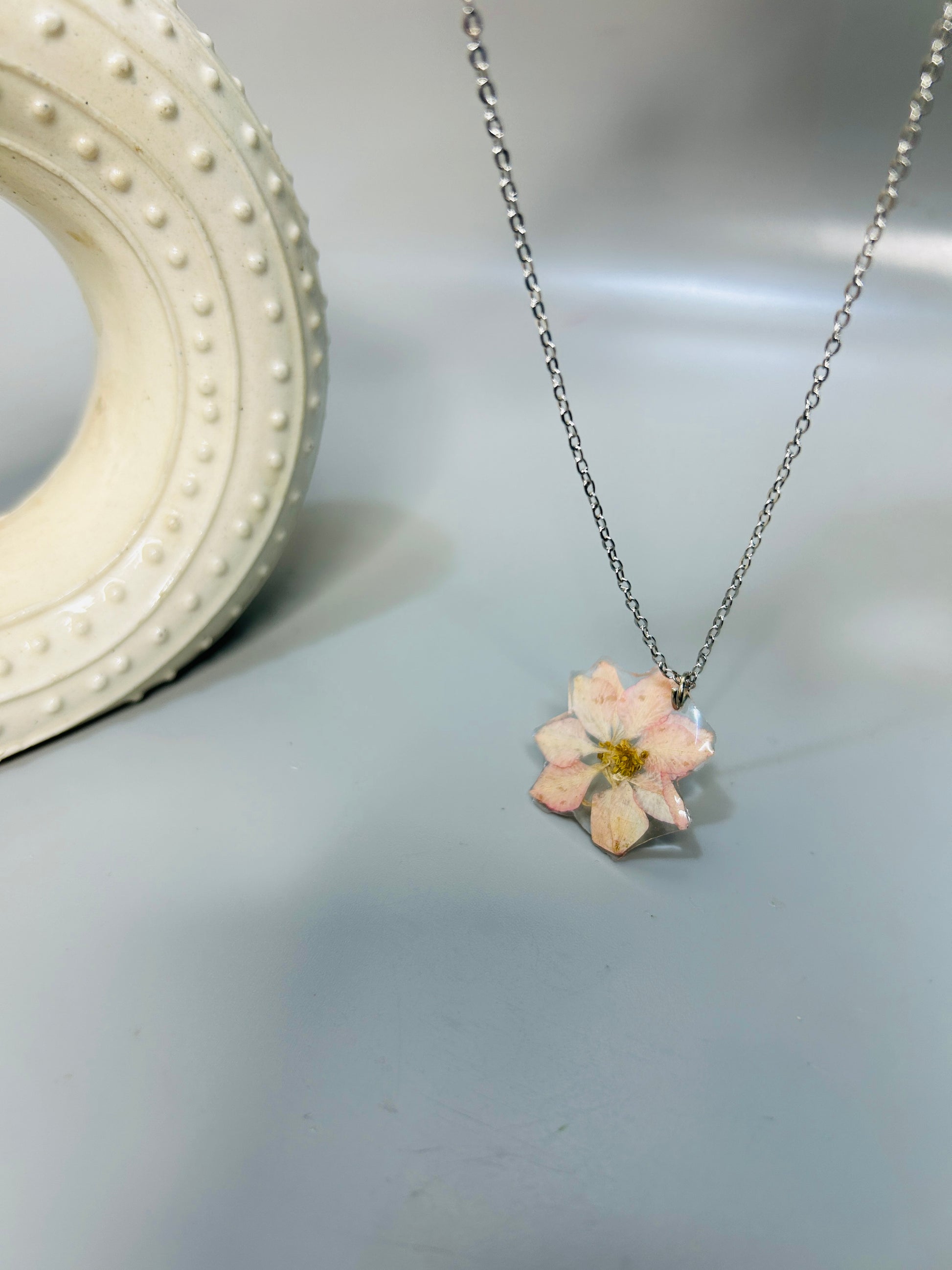 Materials- Silver rim, pressed flower, resin, brass chain