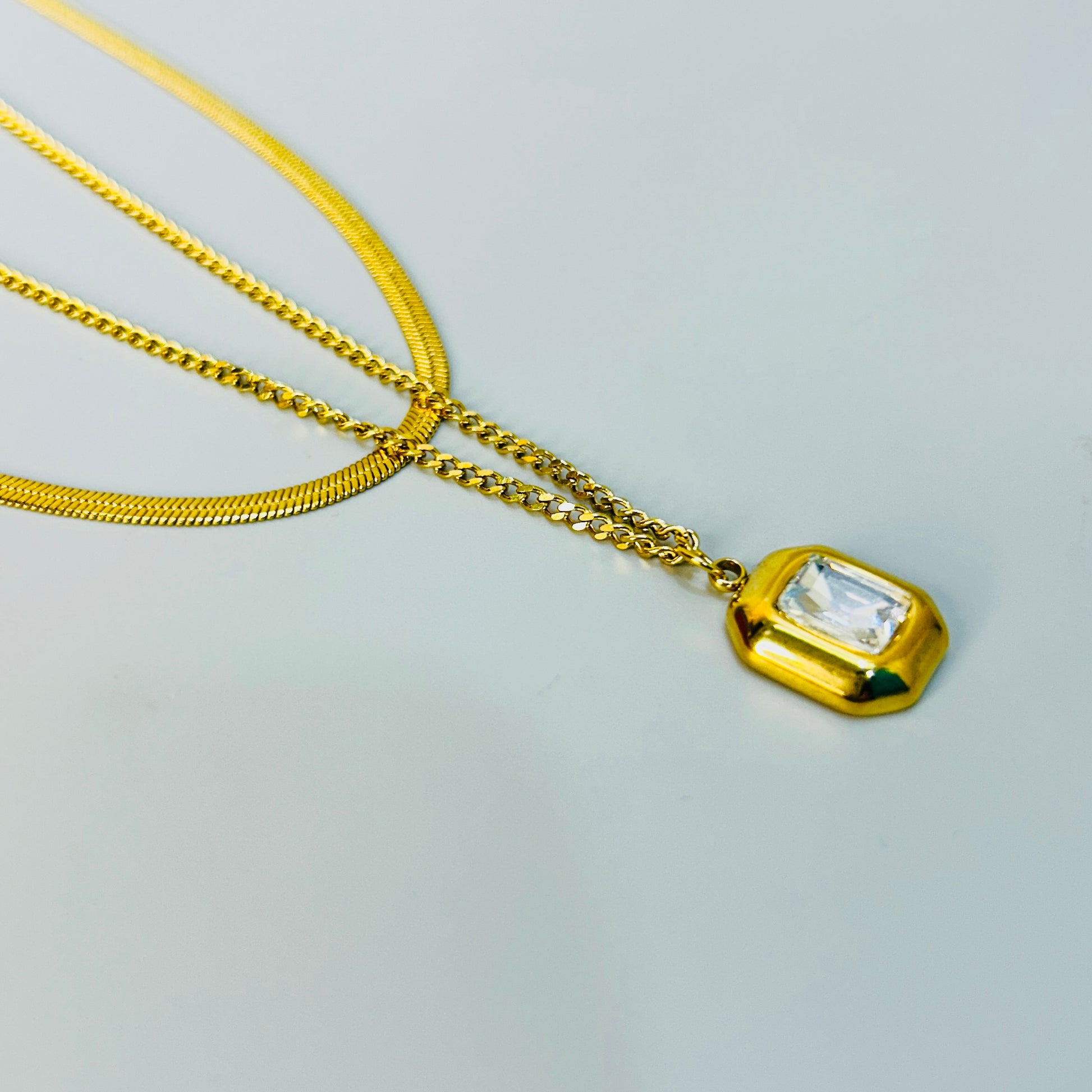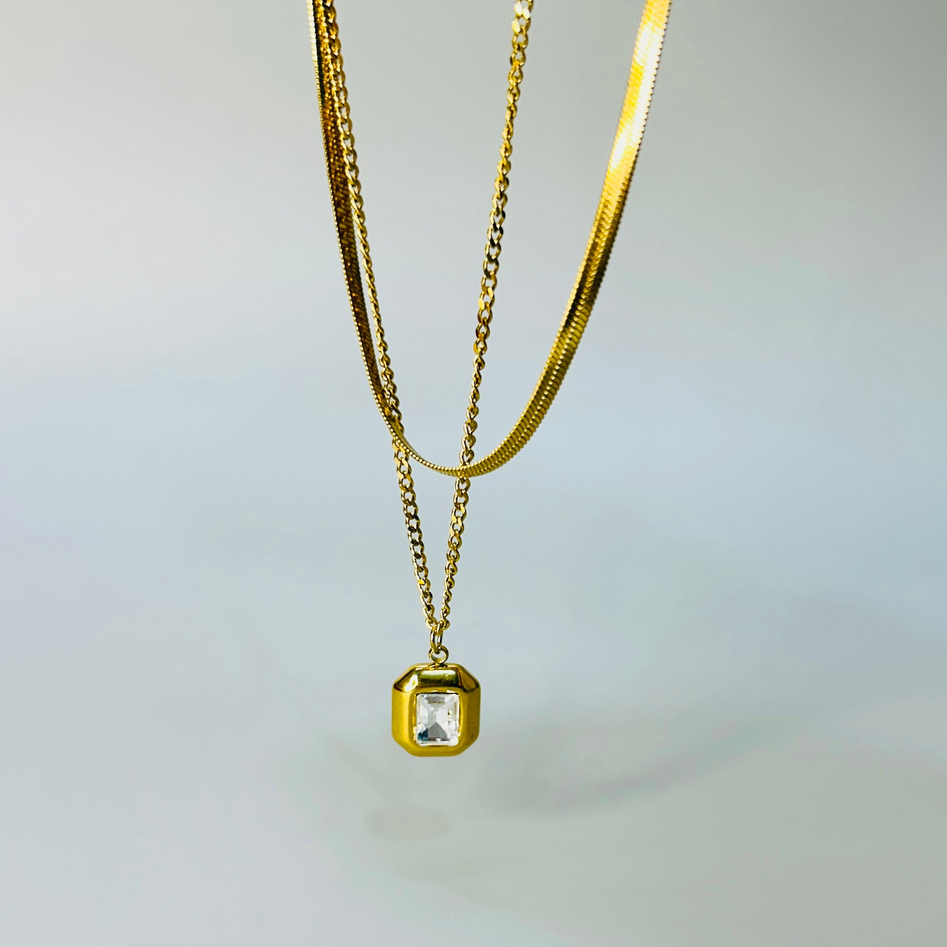 Discover the unique and elegant Layered Hexa Necklace, featuring a combination of snake and delicate chain layers with a stunning hexagon pendant adorned with a beautiful stone. Elevate any outfit with this versatile and stylish accessory. Expertly crafted for a timeless and sophisticated look.