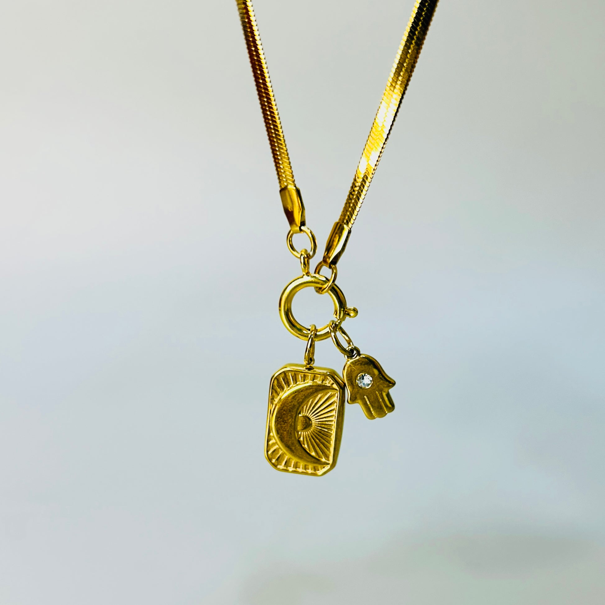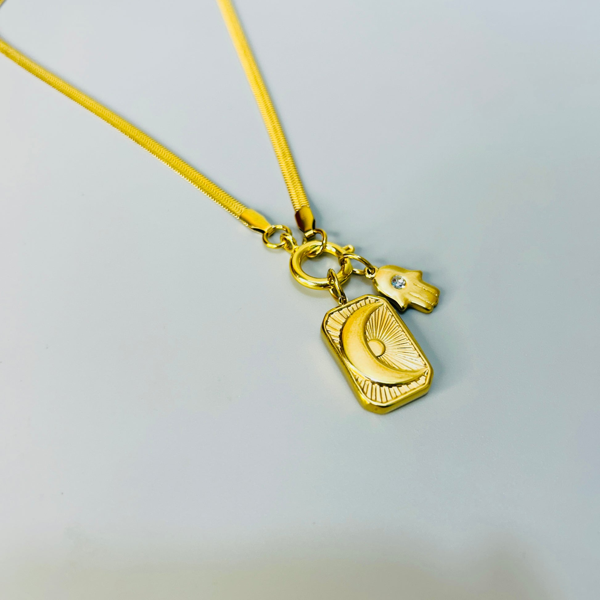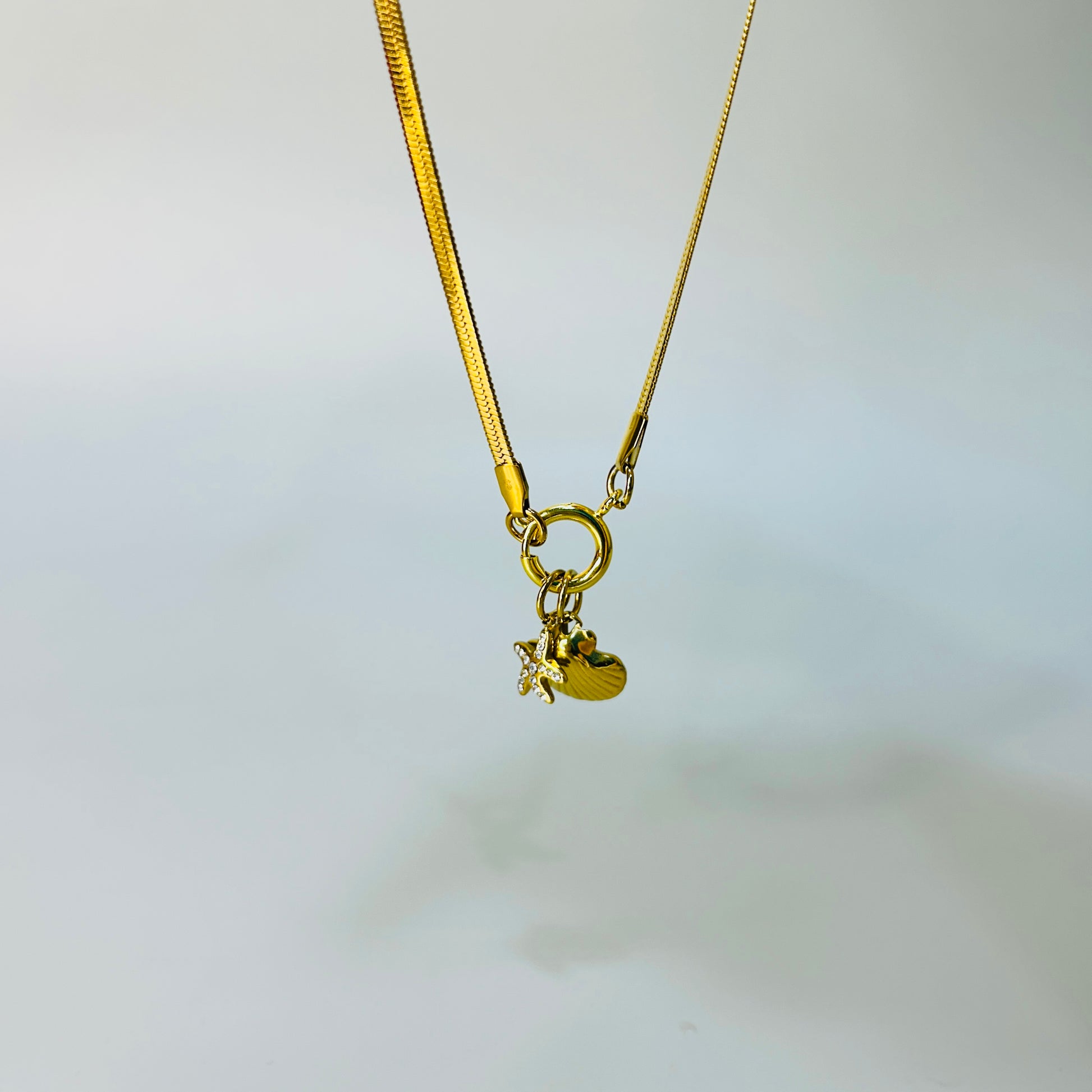 This multi charm snake chain is a stylish accessory with two variants - a delicate combination of crescent and Hamsa charms and a unique mix of shell and starfish charms. Add a touch of whimsy to any outfit with this versatile piece.