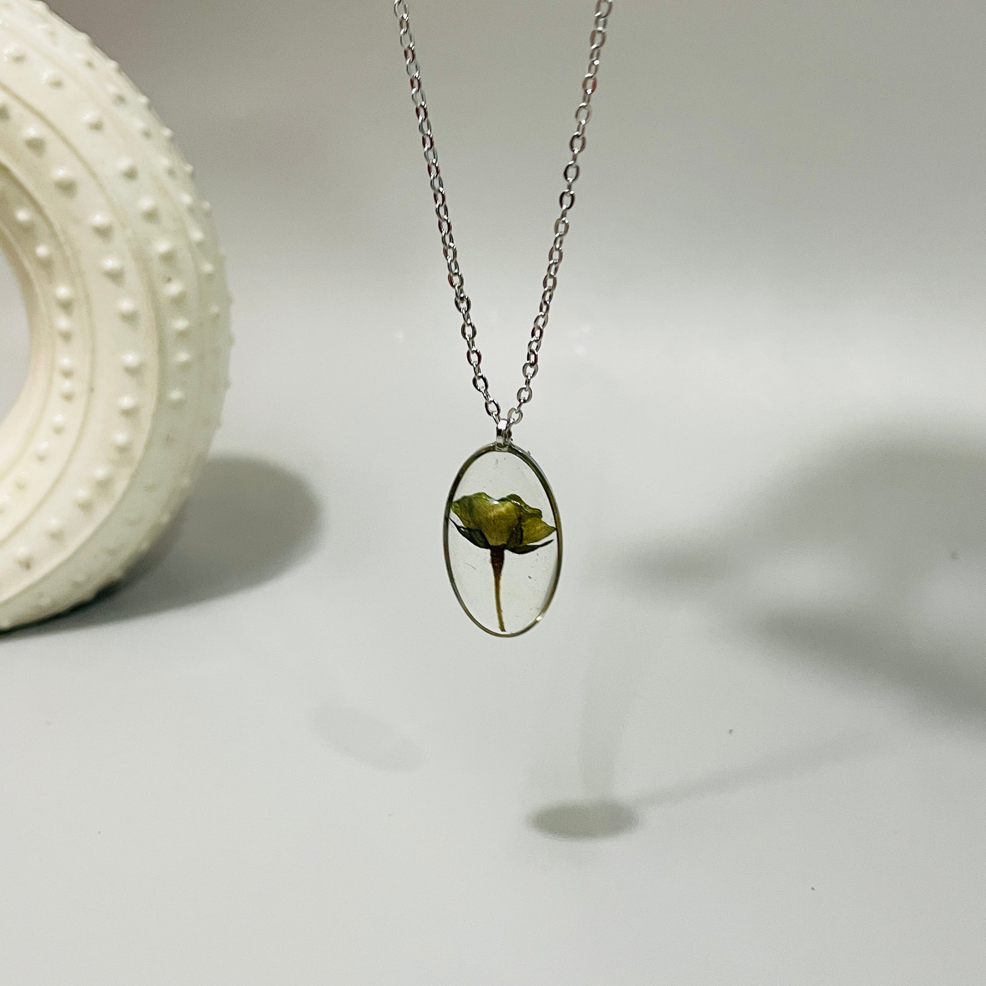 Materials- rose gold/ Silver rim, pressed flower, resin, brass chain
